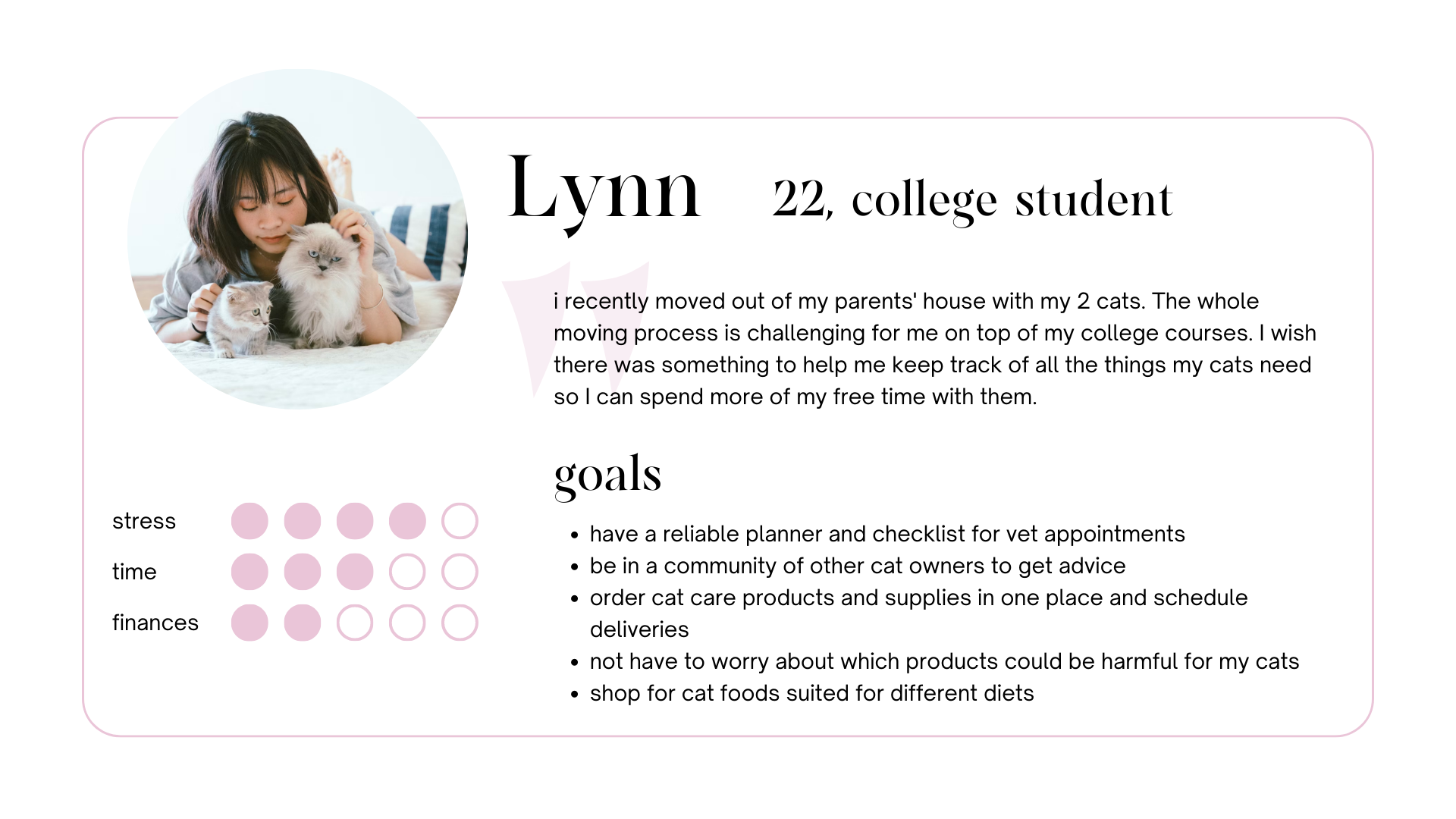 my process started with creating personas that represent my target user groups. having 2 personas can provide insights for 2 distinct groups of cat owners that can benefit from using freeline in their daily lives.