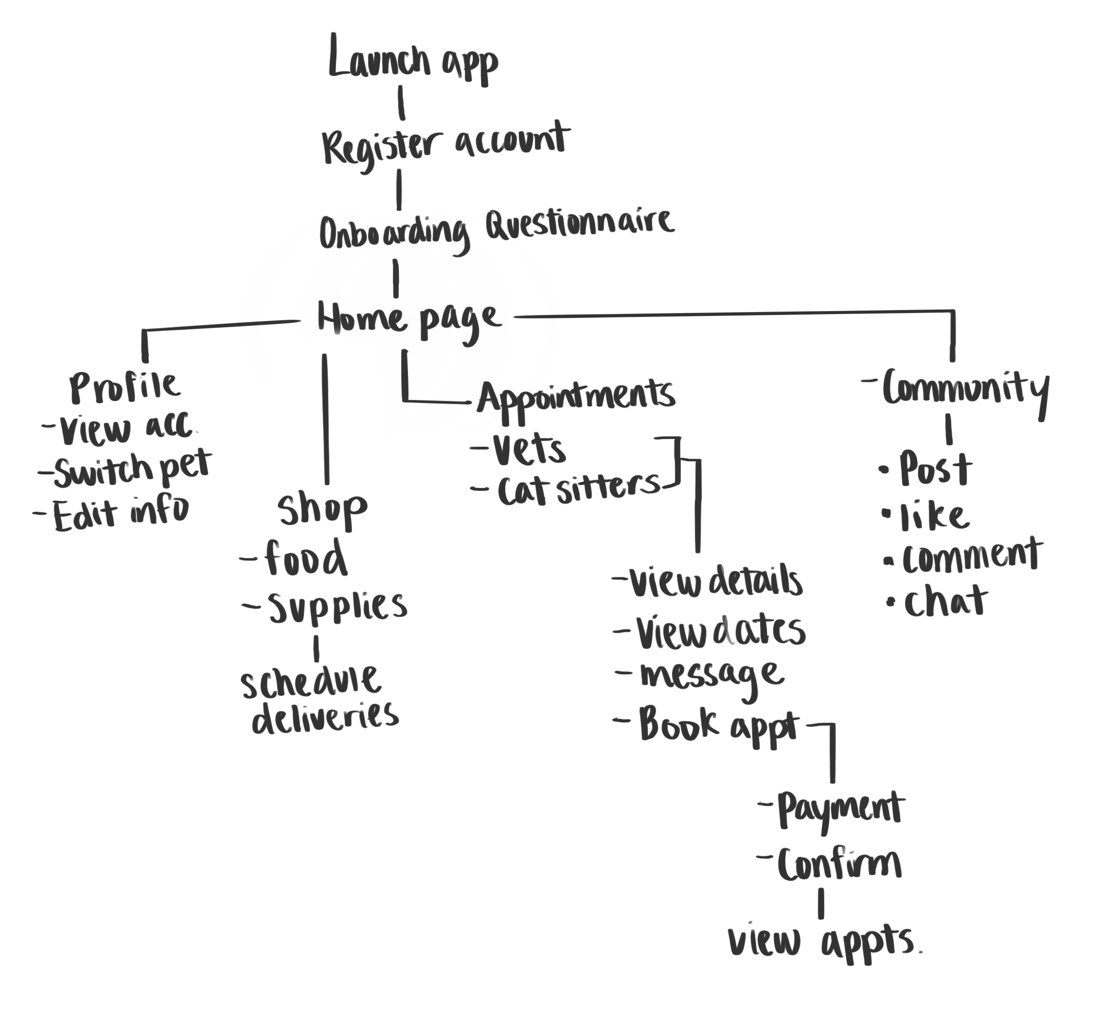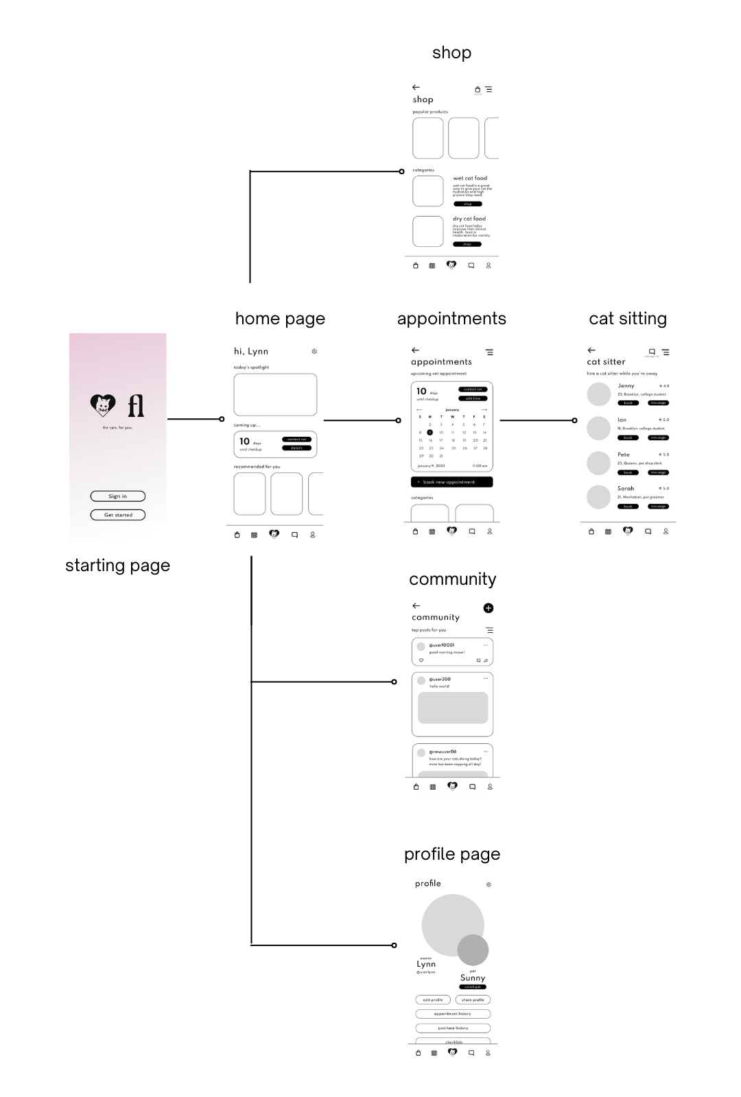 based on the initial interviews with cat owners, competitive audits, and creating personas, I have decided to focus on 4 main functions that freeline will solve for users. The main functions are the pet supplies shop, vet and cat sitter appointments scheduling, and joining the freeline online community.